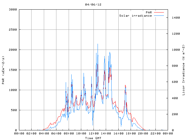 The PML meteorological station, situated on the south-west corner of the building roof, consists of a Hygroclip S3 temperature and humidity sensor housed in a radiation shield, a Mierij Meteo solid state wind sensor (MMW-005), a Chelsea instruments half-hemisphere PAR sensor, a Li-Cor pyranometer (LI-200SZ) and an Omni Instruments 6" tipping bucket raingauge (RG200). The data are logged every 5 minutes using a Pace Scientific XR5 data logger. The real-time rainfall data is likely in error - the correct values will be displayed after a time lag of approximately 24 hours. The meteorological station is sheltered from winds in the north-east and underestimates winds from this quarter. To use these data please contact Dr Tim Smyth.