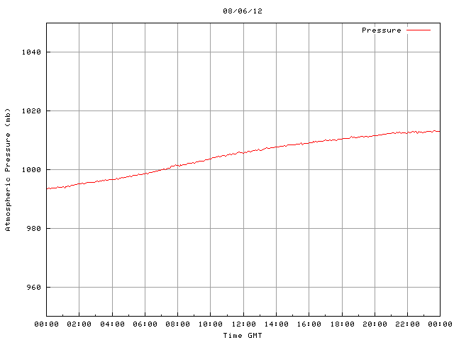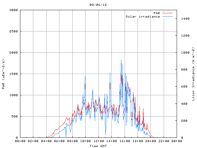 The PML meteorological station, situated on the south-west corner of the building roof, consists of a Hygroclip S3 temperature and humidity sensor housed in a radiation shield, a Mierij Meteo solid state wind sensor (MMW-005), a Chelsea instruments half-hemisphere PAR sensor, a Li-Cor pyranometer (LI-200SZ) and an Omni Instruments 6" tipping bucket raingauge (RG200). The data are logged every 5 minutes using a Pace Scientific XR5 data logger. The real-time rainfall data is likely in error - the correct values will be displayed after a time lag of approximately 24 hours. The meteorological station is sheltered from winds in the north-east and underestimates winds from this quarter. To use these data please contact Dr Tim Smyth.