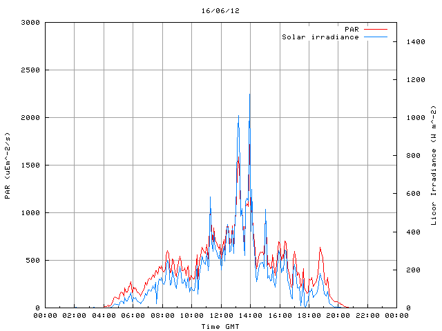 The PML meteorological station, situated on the south-west corner of the building roof, consists of a Hygroclip S3 temperature and humidity sensor housed in a radiation shield, a Mierij Meteo solid state wind sensor (MMW-005), a Chelsea instruments half-hemisphere PAR sensor, a Li-Cor pyranometer (LI-200SZ) and an Omni Instruments 6" tipping bucket raingauge (RG200). The data are logged every 5 minutes using a Pace Scientific XR5 data logger. The real-time rainfall data is likely in error - the correct values will be displayed after a time lag of approximately 24 hours. The meteorological station is sheltered from winds in the north-east and underestimates winds from this quarter. To use these data please contact Dr Tim Smyth.