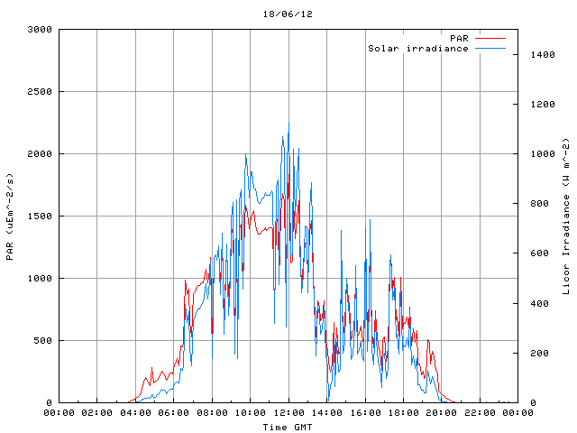 The PML meteorological station, situated on the south-west corner of the building roof, consists of a Hygroclip S3 temperature and humidity sensor housed in a radiation shield, a Mierij Meteo solid state wind sensor (MMW-005), a Chelsea instruments half-hemisphere PAR sensor, a Li-Cor pyranometer (LI-200SZ) and an Omni Instruments 6" tipping bucket raingauge (RG200). The data are logged every 5 minutes using a Pace Scientific XR5 data logger. The real-time rainfall data is likely in error - the correct values will be displayed after a time lag of approximately 24 hours. The meteorological station is sheltered from winds in the north-east and underestimates winds from this quarter. To use these data please contact Dr Tim Smyth.