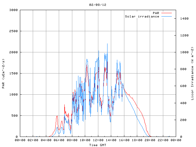 The PML meteorological station, situated on the south-west corner of the building roof, consists of a Hygroclip S3 temperature and humidity sensor housed in a radiation shield, a Mierij Meteo solid state wind sensor (MMW-005), a Chelsea instruments half-hemisphere PAR sensor, a Li-Cor pyranometer (LI-200SZ) and an Omni Instruments 6" tipping bucket raingauge (RG200). The data are logged every 5 minutes using a Pace Scientific XR5 data logger. The real-time rainfall data is likely in error - the correct values will be displayed after a time lag of approximately 24 hours. The meteorological station is sheltered from winds in the north-east and underestimates winds from this quarter. To use these data please contact Dr Tim Smyth.