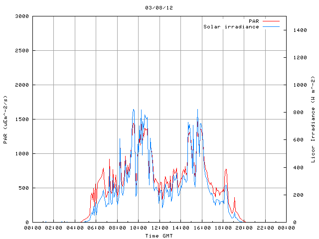 The PML meteorological station, situated on the south-west corner of the building roof, consists of a Hygroclip S3 temperature and humidity sensor housed in a radiation shield, a Mierij Meteo solid state wind sensor (MMW-005), a Chelsea instruments half-hemisphere PAR sensor, a Li-Cor pyranometer (LI-200SZ) and an Omni Instruments 6" tipping bucket raingauge (RG200). The data are logged every 5 minutes using a Pace Scientific XR5 data logger. The real-time rainfall data is likely in error - the correct values will be displayed after a time lag of approximately 24 hours. The meteorological station is sheltered from winds in the north-east and underestimates winds from this quarter. To use these data please contact Dr Tim Smyth.