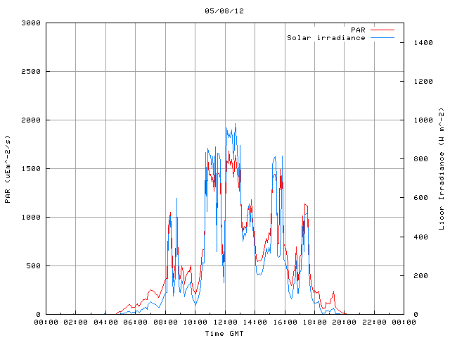 The PML meteorological station, situated on the south-west corner of the building roof, consists of a Hygroclip S3 temperature and humidity sensor housed in a radiation shield, a Mierij Meteo solid state wind sensor (MMW-005), a Chelsea instruments half-hemisphere PAR sensor, a Li-Cor pyranometer (LI-200SZ) and an Omni Instruments 6" tipping bucket raingauge (RG200). The data are logged every 5 minutes using a Pace Scientific XR5 data logger. The real-time rainfall data is likely in error - the correct values will be displayed after a time lag of approximately 24 hours. The meteorological station is sheltered from winds in the north-east and underestimates winds from this quarter. To use these data please contact Dr Tim Smyth.