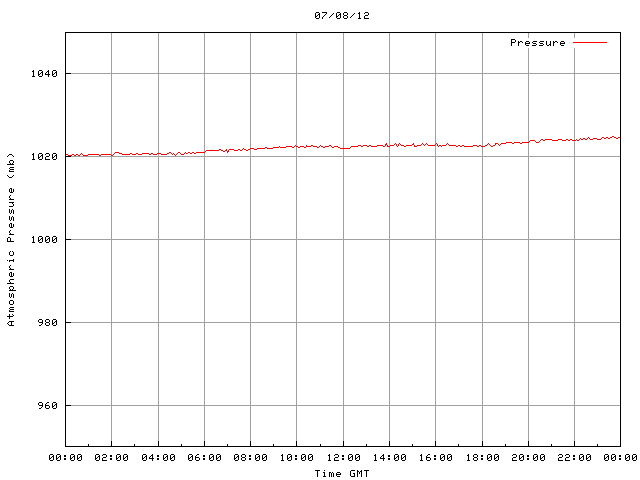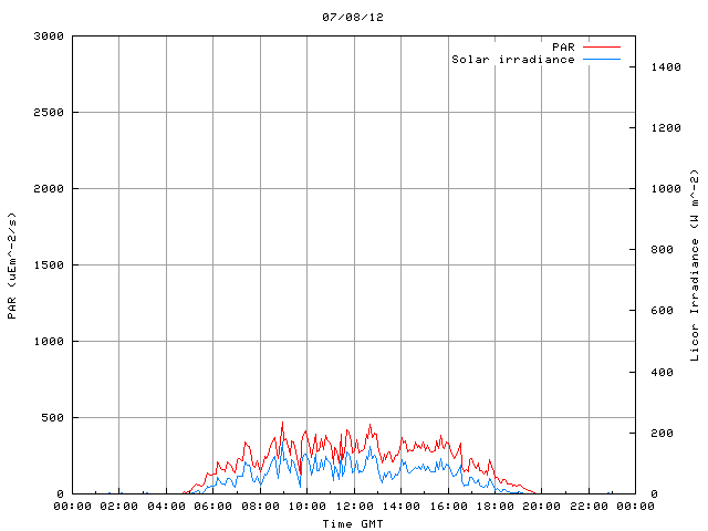The PML meteorological station, situated on the south-west corner of the building roof, consists of a Hygroclip S3 temperature and humidity sensor housed in a radiation shield, a Mierij Meteo solid state wind sensor (MMW-005), a Chelsea instruments half-hemisphere PAR sensor, a Li-Cor pyranometer (LI-200SZ) and an Omni Instruments 6" tipping bucket raingauge (RG200). The data are logged every 5 minutes using a Pace Scientific XR5 data logger. The real-time rainfall data is likely in error - the correct values will be displayed after a time lag of approximately 24 hours. The meteorological station is sheltered from winds in the north-east and underestimates winds from this quarter. To use these data please contact Dr Tim Smyth.