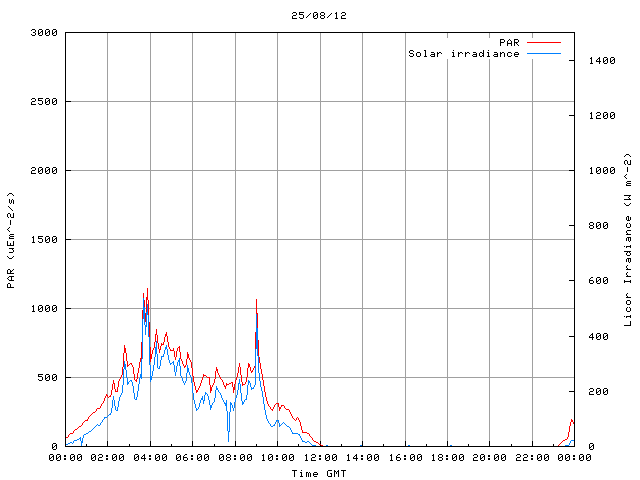 The PML meteorological station, situated on the south-west corner of the building roof, consists of a Hygroclip S3 temperature and humidity sensor housed in a radiation shield, a Mierij Meteo solid state wind sensor (MMW-005), a Chelsea instruments half-hemisphere PAR sensor, a Li-Cor pyranometer (LI-200SZ) and an Omni Instruments 6" tipping bucket raingauge (RG200). The data are logged every 5 minutes using a Pace Scientific XR5 data logger. The real-time rainfall data is likely in error - the correct values will be displayed after a time lag of approximately 24 hours. The meteorological station is sheltered from winds in the north-east and underestimates winds from this quarter. To use these data please contact Dr Tim Smyth.