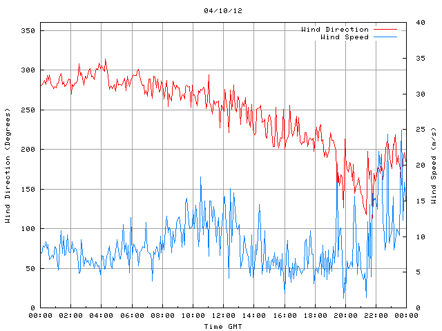 - Max Wind Speed: 25.0 ms-1 Time: 23:41:09 GMT