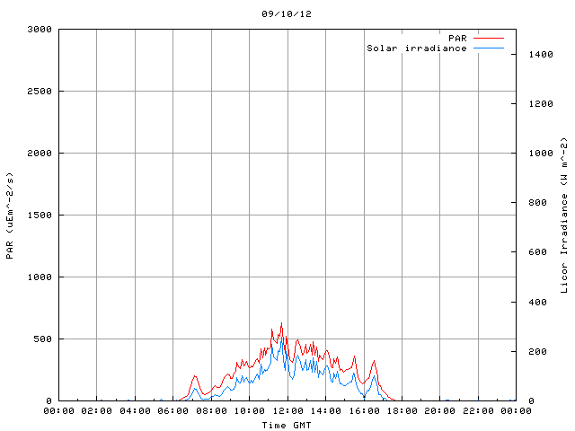 The PML meteorological station, situated on the south-west corner of the building roof, consists of a Hygroclip S3 temperature and humidity sensor housed in a radiation shield, a Mierij Meteo solid state wind sensor (MMW-005), a Chelsea instruments half-hemisphere PAR sensor, a Li-Cor pyranometer (LI-200SZ) and an Omni Instruments 6" tipping bucket raingauge (RG200). The data are logged every 5 minutes using a Pace Scientific XR5 data logger. The real-time rainfall data is likely in error - the correct values will be displayed after a time lag of approximately 24 hours. The meteorological station is sheltered from winds in the north-east and underestimates winds from this quarter. To use these data please contact Dr Tim Smyth.