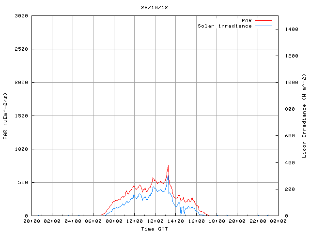 The PML meteorological station, situated on the south-west corner of the building roof, consists of a Hygroclip S3 temperature and humidity sensor housed in a radiation shield, a Mierij Meteo solid state wind sensor (MMW-005), a Chelsea instruments half-hemisphere PAR sensor, a Li-Cor pyranometer (LI-200SZ) and an Omni Instruments 6" tipping bucket raingauge (RG200). The data are logged every 5 minutes using a Pace Scientific XR5 data logger. The real-time rainfall data is likely in error - the correct values will be displayed after a time lag of approximately 24 hours. The meteorological station is sheltered from winds in the north-east and underestimates winds from this quarter. To use these data please contact Dr Tim Smyth.