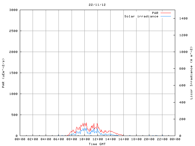 The PML meteorological station, situated on the south-west corner of the building roof, consists of a Hygroclip S3 temperature and humidity sensor housed in a radiation shield, a Mierij Meteo solid state wind sensor (MMW-005), a Chelsea instruments half-hemisphere PAR sensor, a Li-Cor pyranometer (LI-200SZ) and an Omni Instruments 6" tipping bucket raingauge (RG200). The data are logged every 5 minutes using a Pace Scientific XR5 data logger. The real-time rainfall data is likely in error - the correct values will be displayed after a time lag of approximately 24 hours. The meteorological station is sheltered from winds in the north-east and underestimates winds from this quarter. To use these data please contact Dr Tim Smyth.