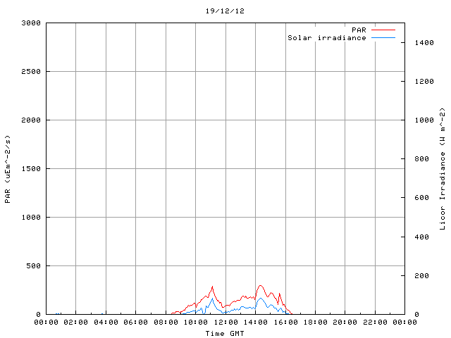 The PML meteorological station, situated on the south-west corner of the building roof, consists of a Hygroclip S3 temperature and humidity sensor housed in a radiation shield, a Mierij Meteo solid state wind sensor (MMW-005), a Chelsea instruments half-hemisphere PAR sensor, a Li-Cor pyranometer (LI-200SZ) and an Omni Instruments 6" tipping bucket raingauge (RG200). The data are logged every 5 minutes using a Pace Scientific XR5 data logger. The real-time rainfall data is likely in error - the correct values will be displayed after a time lag of approximately 24 hours. The meteorological station is sheltered from winds in the north-east and underestimates winds from this quarter. To use these data please contact Dr Tim Smyth.