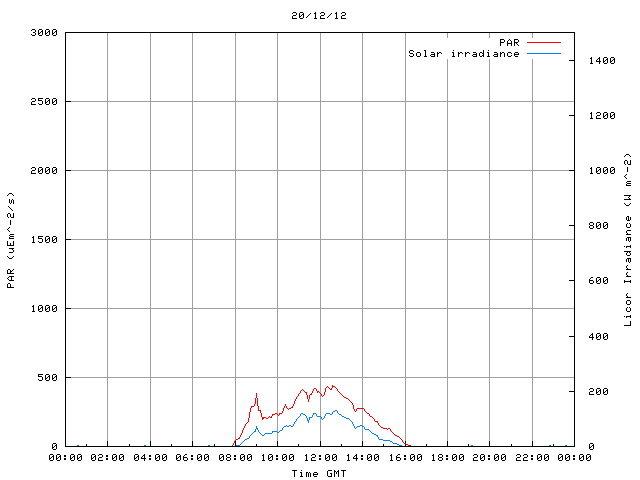 The PML meteorological station, situated on the south-west corner of the building roof, consists of a Hygroclip S3 temperature and humidity sensor housed in a radiation shield, a Mierij Meteo solid state wind sensor (MMW-005), a Chelsea instruments half-hemisphere PAR sensor, a Li-Cor pyranometer (LI-200SZ) and an Omni Instruments 6" tipping bucket raingauge (RG200). The data are logged every 5 minutes using a Pace Scientific XR5 data logger. The real-time rainfall data is likely in error - the correct values will be displayed after a time lag of approximately 24 hours. The meteorological station is sheltered from winds in the north-east and underestimates winds from this quarter. To use these data please contact Dr Tim Smyth.