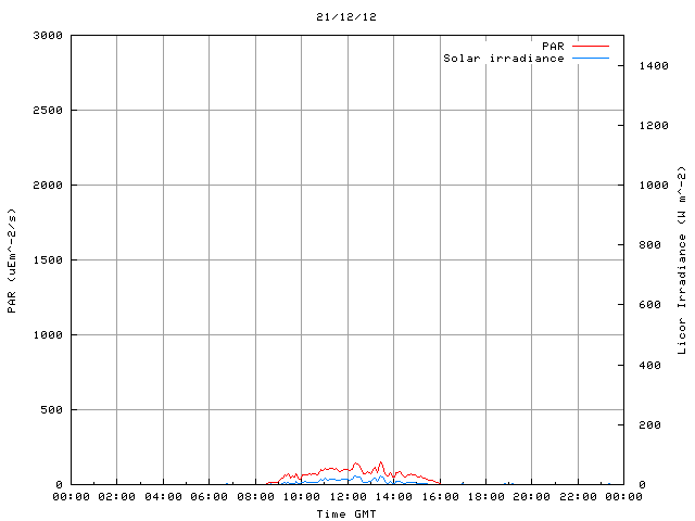 The PML meteorological station, situated on the south-west corner of the building roof, consists of a Hygroclip S3 temperature and humidity sensor housed in a radiation shield, a Mierij Meteo solid state wind sensor (MMW-005), a Chelsea instruments half-hemisphere PAR sensor, a Li-Cor pyranometer (LI-200SZ) and an Omni Instruments 6" tipping bucket raingauge (RG200). The data are logged every 5 minutes using a Pace Scientific XR5 data logger. The real-time rainfall data is likely in error - the correct values will be displayed after a time lag of approximately 24 hours. The meteorological station is sheltered from winds in the north-east and underestimates winds from this quarter. To use these data please contact Dr Tim Smyth.
