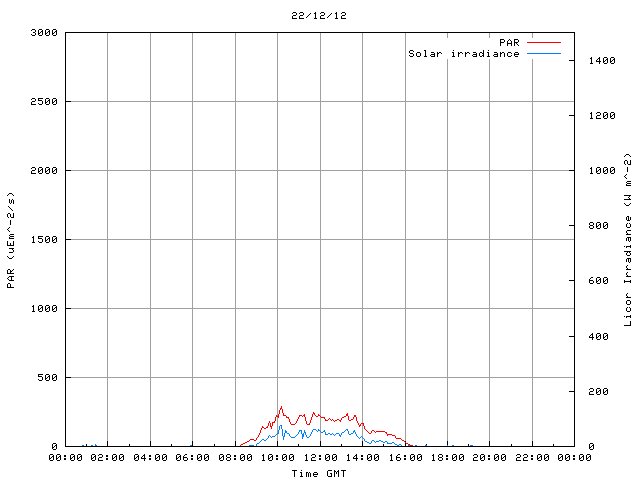 The PML meteorological station, situated on the south-west corner of the building roof, consists of a Hygroclip S3 temperature and humidity sensor housed in a radiation shield, a Mierij Meteo solid state wind sensor (MMW-005), a Chelsea instruments half-hemisphere PAR sensor, a Li-Cor pyranometer (LI-200SZ) and an Omni Instruments 6" tipping bucket raingauge (RG200). The data are logged every 5 minutes using a Pace Scientific XR5 data logger. The real-time rainfall data is likely in error - the correct values will be displayed after a time lag of approximately 24 hours. The meteorological station is sheltered from winds in the north-east and underestimates winds from this quarter. To use these data please contact Dr Tim Smyth.