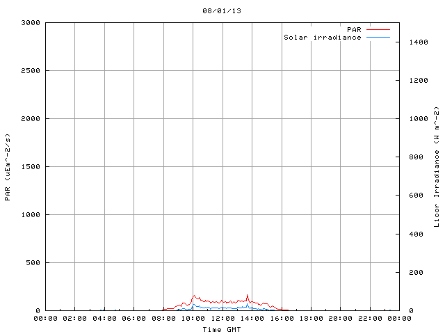 The PML meteorological station, situated on the south-west corner of the building roof, consists of a Hygroclip S3 temperature and humidity sensor housed in a radiation shield, a Mierij Meteo solid state wind sensor (MMW-005), a Chelsea instruments half-hemisphere PAR sensor, a Li-Cor pyranometer (LI-200SZ) and an Omni Instruments 6" tipping bucket raingauge (RG200). The data are logged every 5 minutes using a Pace Scientific XR5 data logger. The real-time rainfall data is likely in error - the correct values will be displayed after a time lag of approximately 24 hours. The meteorological station is sheltered from winds in the north-east and underestimates winds from this quarter. To use these data please contact Dr Tim Smyth.