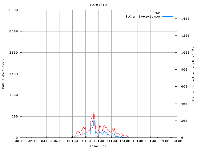The PML meteorological station, situated on the south-west corner of the building roof, consists of a Hygroclip S3 temperature and humidity sensor housed in a radiation shield, a Mierij Meteo solid state wind sensor (MMW-005), a Chelsea instruments half-hemisphere PAR sensor, a Li-Cor pyranometer (LI-200SZ) and an Omni Instruments 6" tipping bucket raingauge (RG200). The data are logged every 5 minutes using a Pace Scientific XR5 data logger. The real-time rainfall data is likely in error - the correct values will be displayed after a time lag of approximately 24 hours. The meteorological station is sheltered from winds in the north-east and underestimates winds from this quarter. To use these data please contact Dr Tim Smyth.