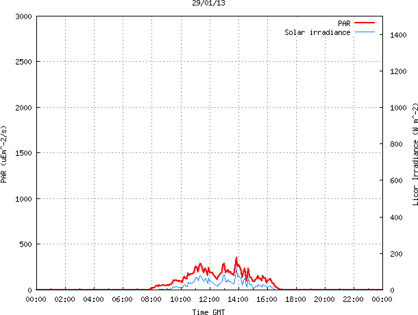 The PML meteorological station, situated on the south-west corner of the building roof, consists of a Hygroclip S3 temperature and humidity sensor housed in a radiation shield, a Mierij Meteo solid state wind sensor (MMW-005), a Chelsea instruments half-hemisphere PAR sensor, a Li-Cor pyranometer (LI-200SZ) and an Omni Instruments 6" tipping bucket raingauge (RG200). The data are logged every 5 minutes using a Pace Scientific XR5 data logger. The real-time rainfall data is likely in error - the correct values will be displayed after a time lag of approximately 24 hours. The meteorological station is sheltered from winds in the north-east and underestimates winds from this quarter. To use these data please contact Dr Tim Smyth.