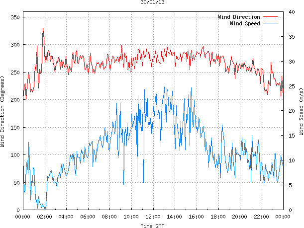 - Max Wind Speed: 24.8 ms-1 Time: 13:01:09 GMT