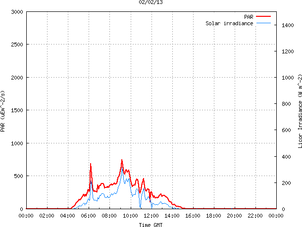 The PML meteorological station, situated on the south-west corner of the building roof, consists of a Hygroclip S3 temperature and humidity sensor housed in a radiation shield, a Mierij Meteo solid state wind sensor (MMW-005), a Chelsea instruments half-hemisphere PAR sensor, a Li-Cor pyranometer (LI-200SZ) and an Omni Instruments 6" tipping bucket raingauge (RG200). The data are logged every 5 minutes using a Pace Scientific XR5 data logger. The real-time rainfall data is likely in error - the correct values will be displayed after a time lag of approximately 24 hours. The meteorological station is sheltered from winds in the north-east and underestimates winds from this quarter. To use these data please contact Dr Tim Smyth.