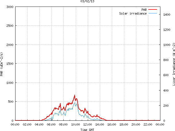 The PML meteorological station, situated on the south-west corner of the building roof, consists of a Hygroclip S3 temperature and humidity sensor housed in a radiation shield, a Mierij Meteo solid state wind sensor (MMW-005), a Chelsea instruments half-hemisphere PAR sensor, a Li-Cor pyranometer (LI-200SZ) and an Omni Instruments 6" tipping bucket raingauge (RG200). The data are logged every 5 minutes using a Pace Scientific XR5 data logger. The real-time rainfall data is likely in error - the correct values will be displayed after a time lag of approximately 24 hours. The meteorological station is sheltered from winds in the north-east and underestimates winds from this quarter. To use these data please contact Dr Tim Smyth.