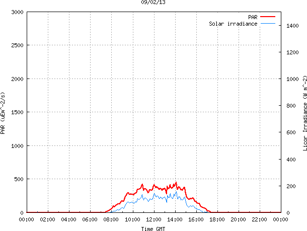 The PML meteorological station, situated on the south-west corner of the building roof, consists of a Hygroclip S3 temperature and humidity sensor housed in a radiation shield, a Mierij Meteo solid state wind sensor (MMW-005), a Chelsea instruments half-hemisphere PAR sensor, a Li-Cor pyranometer (LI-200SZ) and an Omni Instruments 6" tipping bucket raingauge (RG200). The data are logged every 5 minutes using a Pace Scientific XR5 data logger. The real-time rainfall data is likely in error - the correct values will be displayed after a time lag of approximately 24 hours. The meteorological station is sheltered from winds in the north-east and underestimates winds from this quarter. To use these data please contact Dr Tim Smyth.
