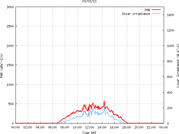 The PML meteorological station, situated on the south-west corner of the building roof, consists of a Hygroclip S3 temperature and humidity sensor housed in a radiation shield, a Mierij Meteo solid state wind sensor (MMW-005), a Chelsea instruments half-hemisphere PAR sensor, a Li-Cor pyranometer (LI-200SZ) and an Omni Instruments 6" tipping bucket raingauge (RG200). The data are logged every 5 minutes using a Pace Scientific XR5 data logger. The real-time rainfall data is likely in error - the correct values will be displayed after a time lag of approximately 24 hours. The meteorological station is sheltered from winds in the north-east and underestimates winds from this quarter. To use these data please contact Dr Tim Smyth.