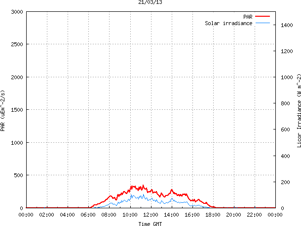 The PML meteorological station, situated on the south-west corner of the building roof, consists of a Hygroclip S3 temperature and humidity sensor housed in a radiation shield, a Mierij Meteo solid state wind sensor (MMW-005), a Chelsea instruments half-hemisphere PAR sensor, a Li-Cor pyranometer (LI-200SZ) and an Omni Instruments 6" tipping bucket raingauge (RG200). The data are logged every 5 minutes using a Pace Scientific XR5 data logger. The real-time rainfall data is likely in error - the correct values will be displayed after a time lag of approximately 24 hours. The meteorological station is sheltered from winds in the north-east and underestimates winds from this quarter. To use these data please contact Dr Tim Smyth.