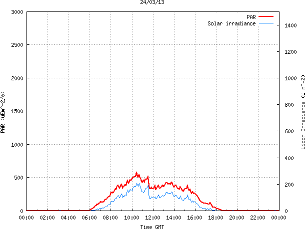 The PML meteorological station, situated on the south-west corner of the building roof, consists of a Hygroclip S3 temperature and humidity sensor housed in a radiation shield, a Mierij Meteo solid state wind sensor (MMW-005), a Chelsea instruments half-hemisphere PAR sensor, a Li-Cor pyranometer (LI-200SZ) and an Omni Instruments 6" tipping bucket raingauge (RG200). The data are logged every 5 minutes using a Pace Scientific XR5 data logger. The real-time rainfall data is likely in error - the correct values will be displayed after a time lag of approximately 24 hours. The meteorological station is sheltered from winds in the north-east and underestimates winds from this quarter. To use these data please contact Dr Tim Smyth.