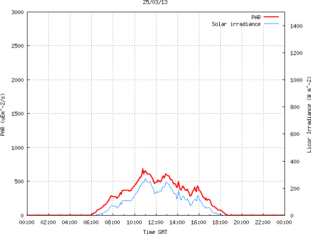 The PML meteorological station, situated on the south-west corner of the building roof, consists of a Hygroclip S3 temperature and humidity sensor housed in a radiation shield, a Mierij Meteo solid state wind sensor (MMW-005), a Chelsea instruments half-hemisphere PAR sensor, a Li-Cor pyranometer (LI-200SZ) and an Omni Instruments 6" tipping bucket raingauge (RG200). The data are logged every 5 minutes using a Pace Scientific XR5 data logger. The real-time rainfall data is likely in error - the correct values will be displayed after a time lag of approximately 24 hours. The meteorological station is sheltered from winds in the north-east and underestimates winds from this quarter. To use these data please contact Dr Tim Smyth.