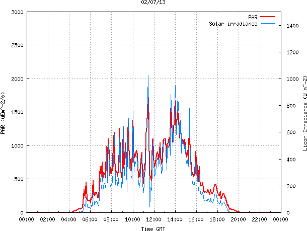 The PML meteorological station, situated on the south-west corner of the building roof, consists of a Hygroclip S3 temperature and humidity sensor housed in a radiation shield, a Mierij Meteo solid state wind sensor (MMW-005), a Chelsea instruments half-hemisphere PAR sensor, a Li-Cor pyranometer (LI-200SZ) and an Omni Instruments 6" tipping bucket raingauge (RG200). The data are logged every 5 minutes using a Pace Scientific XR5 data logger. The real-time rainfall data is likely in error - the correct values will be displayed after a time lag of approximately 24 hours. The meteorological station is sheltered from winds in the north-east and underestimates winds from this quarter. To use these data please contact Dr Tim Smyth.