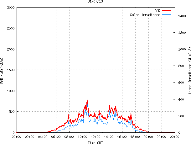 The PML meteorological station, situated on the south-west corner of the building roof, consists of a Hygroclip S3 temperature and humidity sensor housed in a radiation shield, a Mierij Meteo solid state wind sensor (MMW-005), a Chelsea instruments half-hemisphere PAR sensor, a Li-Cor pyranometer (LI-200SZ) and an Omni Instruments 6" tipping bucket raingauge (RG200). The data are logged every 5 minutes using a Pace Scientific XR5 data logger. The real-time rainfall data is likely in error - the correct values will be displayed after a time lag of approximately 24 hours. The meteorological station is sheltered from winds in the north-east and underestimates winds from this quarter. To use these data please contact Dr Tim Smyth.