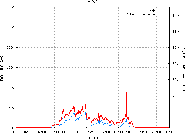 The PML meteorological station, situated on the south-west corner of the building roof, consists of a Hygroclip S3 temperature and humidity sensor housed in a radiation shield, a Mierij Meteo solid state wind sensor (MMW-005), a Chelsea instruments half-hemisphere PAR sensor, a Li-Cor pyranometer (LI-200SZ) and an Omni Instruments 6" tipping bucket raingauge (RG200). The data are logged every 5 minutes using a Pace Scientific XR5 data logger. The real-time rainfall data is likely in error - the correct values will be displayed after a time lag of approximately 24 hours. The meteorological station is sheltered from winds in the north-east and underestimates winds from this quarter. To use these data please contact Dr Tim Smyth.