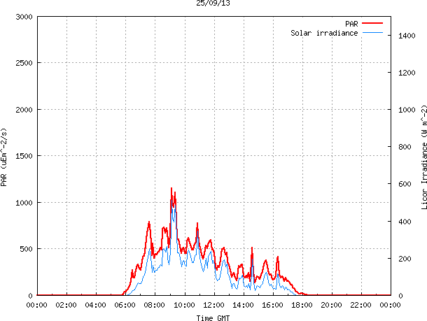 The PML meteorological station, situated on the south-west corner of the building roof, consists of a Hygroclip S3 temperature and humidity sensor housed in a radiation shield, a Mierij Meteo solid state wind sensor (MMW-005), a Chelsea instruments half-hemisphere PAR sensor, a Li-Cor pyranometer (LI-200SZ) and an Omni Instruments 6" tipping bucket raingauge (RG200). The data are logged every 5 minutes using a Pace Scientific XR5 data logger. The real-time rainfall data is likely in error - the correct values will be displayed after a time lag of approximately 24 hours. The meteorological station is sheltered from winds in the north-east and underestimates winds from this quarter. To use these data please contact Dr Tim Smyth.