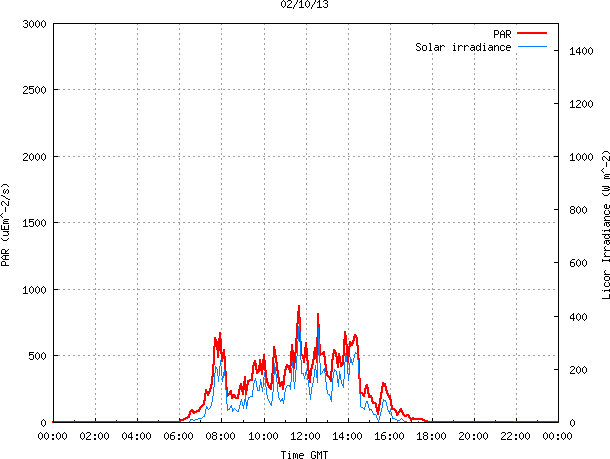 The PML meteorological station, situated on the south-west corner of the building roof, consists of a Hygroclip S3 temperature and humidity sensor housed in a radiation shield, a Mierij Meteo solid state wind sensor (MMW-005), a Chelsea instruments half-hemisphere PAR sensor, a Li-Cor pyranometer (LI-200SZ) and an Omni Instruments 6" tipping bucket raingauge (RG200). The data are logged every 5 minutes using a Pace Scientific XR5 data logger. The real-time rainfall data is likely in error - the correct values will be displayed after a time lag of approximately 24 hours. The meteorological station is sheltered from winds in the north-east and underestimates winds from this quarter. To use these data please contact Dr Tim Smyth.