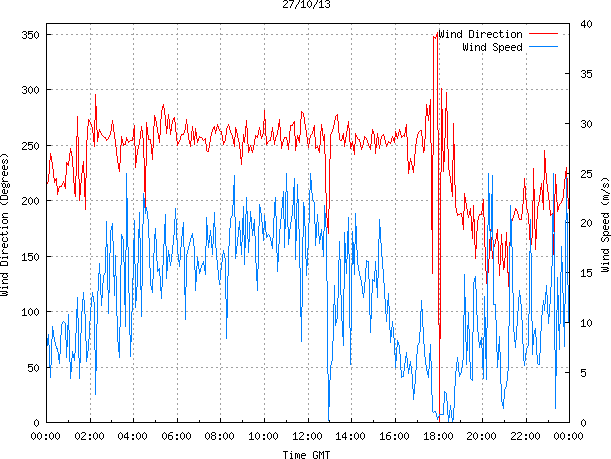 - Max Wind Speed: 25.0 ms-1 Time: 3:41:09 GMT