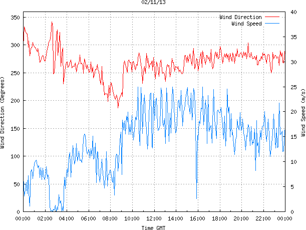 - Max Wind Speed: 25.0 ms-1 Time: 10:31:09 GMT