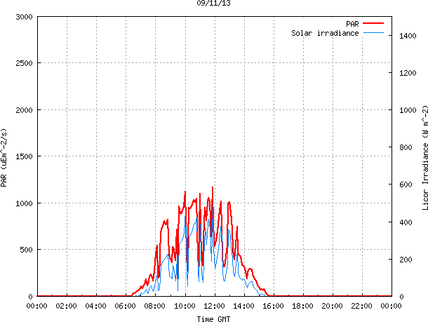 The PML meteorological station, situated on the south-west corner of the building roof, consists of a Hygroclip S3 temperature and humidity sensor housed in a radiation shield, a Mierij Meteo solid state wind sensor (MMW-005), a Chelsea instruments half-hemisphere PAR sensor, a Li-Cor pyranometer (LI-200SZ) and an Omni Instruments 6" tipping bucket raingauge (RG200). The data are logged every 5 minutes using a Pace Scientific XR5 data logger. The real-time rainfall data is likely in error - the correct values will be displayed after a time lag of approximately 24 hours. The meteorological station is sheltered from winds in the north-east and underestimates winds from this quarter. To use these data please contact Dr Tim Smyth.