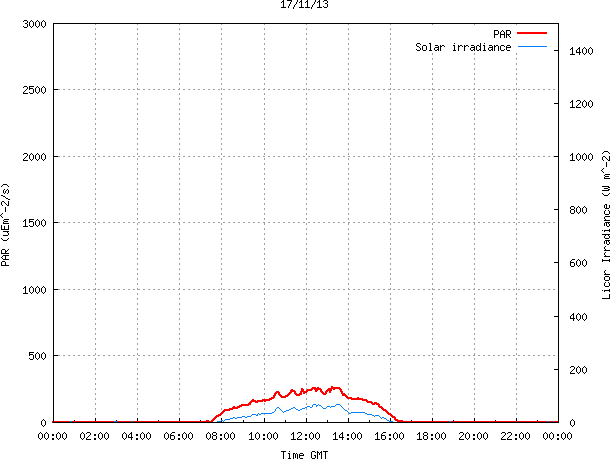 The PML meteorological station, situated on the south-west corner of the building roof, consists of a Hygroclip S3 temperature and humidity sensor housed in a radiation shield, a Mierij Meteo solid state wind sensor (MMW-005), a Chelsea instruments half-hemisphere PAR sensor, a Li-Cor pyranometer (LI-200SZ) and an Omni Instruments 6" tipping bucket raingauge (RG200). The data are logged every 5 minutes using a Pace Scientific XR5 data logger. The real-time rainfall data is likely in error - the correct values will be displayed after a time lag of approximately 24 hours. The meteorological station is sheltered from winds in the north-east and underestimates winds from this quarter. To use these data please contact Dr Tim Smyth.