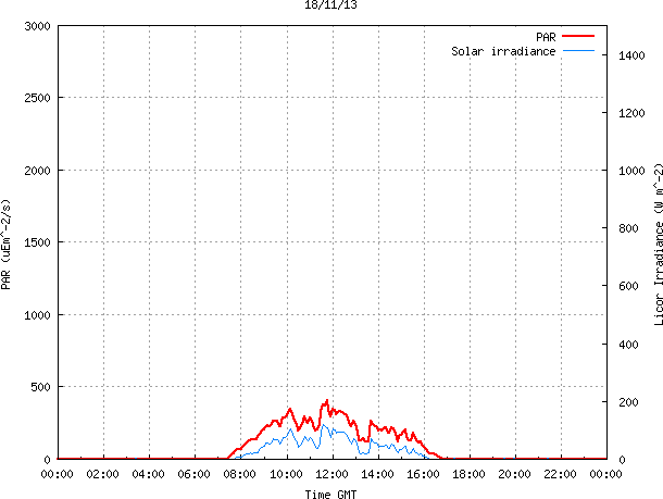 The PML meteorological station, situated on the south-west corner of the building roof, consists of a Hygroclip S3 temperature and humidity sensor housed in a radiation shield, a Mierij Meteo solid state wind sensor (MMW-005), a Chelsea instruments half-hemisphere PAR sensor, a Li-Cor pyranometer (LI-200SZ) and an Omni Instruments 6" tipping bucket raingauge (RG200). The data are logged every 5 minutes using a Pace Scientific XR5 data logger. The real-time rainfall data is likely in error - the correct values will be displayed after a time lag of approximately 24 hours. The meteorological station is sheltered from winds in the north-east and underestimates winds from this quarter. To use these data please contact Dr Tim Smyth.