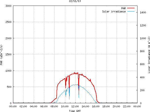 The PML meteorological station, situated on the south-west corner of the building roof, consists of a Hygroclip S3 temperature and humidity sensor housed in a radiation shield, a Mierij Meteo solid state wind sensor (MMW-005), a Chelsea instruments half-hemisphere PAR sensor, a Li-Cor pyranometer (LI-200SZ) and an Omni Instruments 6" tipping bucket raingauge (RG200). The data are logged every 5 minutes using a Pace Scientific XR5 data logger. The real-time rainfall data is likely in error - the correct values will be displayed after a time lag of approximately 24 hours. The meteorological station is sheltered from winds in the north-east and underestimates winds from this quarter. To use these data please contact Dr Tim Smyth.