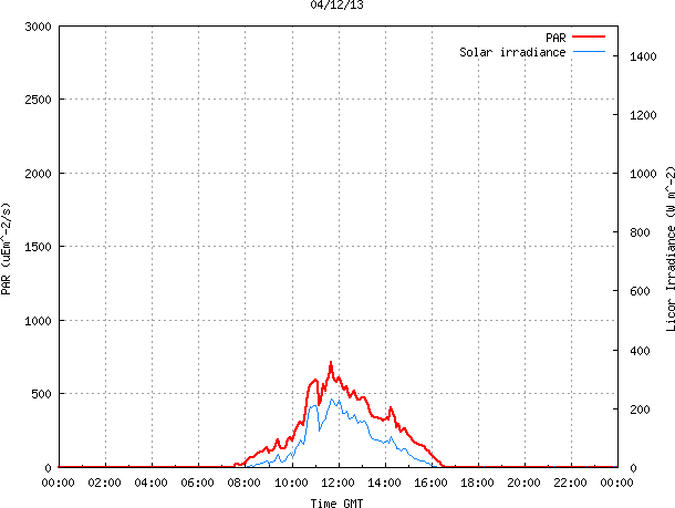 The PML meteorological station, situated on the south-west corner of the building roof, consists of a Hygroclip S3 temperature and humidity sensor housed in a radiation shield, a Mierij Meteo solid state wind sensor (MMW-005), a Chelsea instruments half-hemisphere PAR sensor, a Li-Cor pyranometer (LI-200SZ) and an Omni Instruments 6" tipping bucket raingauge (RG200). The data are logged every 5 minutes using a Pace Scientific XR5 data logger. The real-time rainfall data is likely in error - the correct values will be displayed after a time lag of approximately 24 hours. The meteorological station is sheltered from winds in the north-east and underestimates winds from this quarter. To use these data please contact Dr Tim Smyth.
