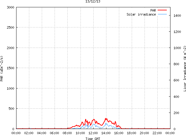 The PML meteorological station, situated on the south-west corner of the building roof, consists of a Hygroclip S3 temperature and humidity sensor housed in a radiation shield, a Mierij Meteo solid state wind sensor (MMW-005), a Chelsea instruments half-hemisphere PAR sensor, a Li-Cor pyranometer (LI-200SZ) and an Omni Instruments 6" tipping bucket raingauge (RG200). The data are logged every 5 minutes using a Pace Scientific XR5 data logger. The real-time rainfall data is likely in error - the correct values will be displayed after a time lag of approximately 24 hours. The meteorological station is sheltered from winds in the north-east and underestimates winds from this quarter. To use these data please contact Dr Tim Smyth.