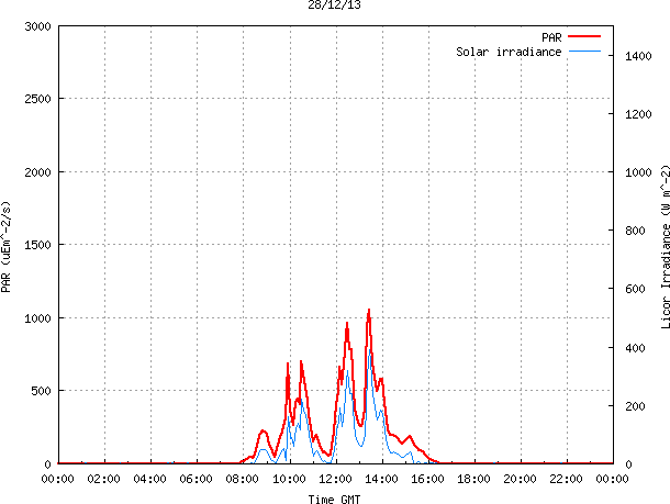 The PML meteorological station, situated on the south-west corner of the building roof, consists of a Hygroclip S3 temperature and humidity sensor housed in a radiation shield, a Mierij Meteo solid state wind sensor (MMW-005), a Chelsea instruments half-hemisphere PAR sensor, a Li-Cor pyranometer (LI-200SZ) and an Omni Instruments 6" tipping bucket raingauge (RG200). The data are logged every 5 minutes using a Pace Scientific XR5 data logger. The real-time rainfall data is likely in error - the correct values will be displayed after a time lag of approximately 24 hours. The meteorological station is sheltered from winds in the north-east and underestimates winds from this quarter. To use these data please contact Dr Tim Smyth.
