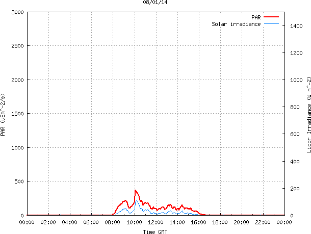 The PML meteorological station, situated on the south-west corner of the building roof, consists of a Hygroclip S3 temperature and humidity sensor housed in a radiation shield, a Mierij Meteo solid state wind sensor (MMW-005), a Chelsea instruments half-hemisphere PAR sensor, a Li-Cor pyranometer (LI-200SZ) and an Omni Instruments 6" tipping bucket raingauge (RG200). The data are logged every 5 minutes using a Pace Scientific XR5 data logger. The real-time rainfall data is likely in error - the correct values will be displayed after a time lag of approximately 24 hours. The meteorological station is sheltered from winds in the north-east and underestimates winds from this quarter. To use these data please contact Dr Tim Smyth.
