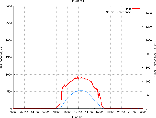 The PML meteorological station, situated on the south-west corner of the building roof, consists of a Hygroclip S3 temperature and humidity sensor housed in a radiation shield, a Mierij Meteo solid state wind sensor (MMW-005), a Chelsea instruments half-hemisphere PAR sensor, a Li-Cor pyranometer (LI-200SZ) and an Omni Instruments 6" tipping bucket raingauge (RG200). The data are logged every 5 minutes using a Pace Scientific XR5 data logger. The real-time rainfall data is likely in error - the correct values will be displayed after a time lag of approximately 24 hours. The meteorological station is sheltered from winds in the north-east and underestimates winds from this quarter. To use these data please contact Dr Tim Smyth.