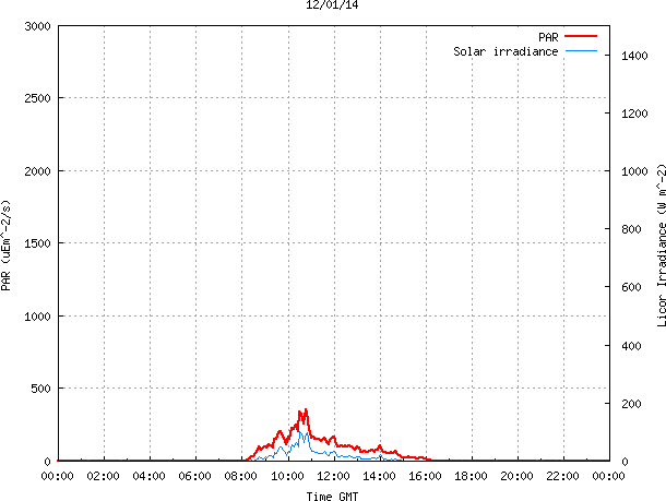 The PML meteorological station, situated on the south-west corner of the building roof, consists of a Hygroclip S3 temperature and humidity sensor housed in a radiation shield, a Mierij Meteo solid state wind sensor (MMW-005), a Chelsea instruments half-hemisphere PAR sensor, a Li-Cor pyranometer (LI-200SZ) and an Omni Instruments 6" tipping bucket raingauge (RG200). The data are logged every 5 minutes using a Pace Scientific XR5 data logger. The real-time rainfall data is likely in error - the correct values will be displayed after a time lag of approximately 24 hours. The meteorological station is sheltered from winds in the north-east and underestimates winds from this quarter. To use these data please contact Dr Tim Smyth.