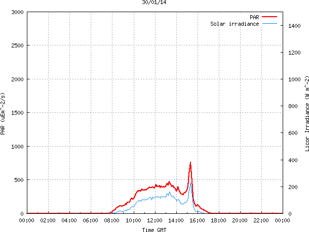 The PML meteorological station, situated on the south-west corner of the building roof, consists of a Hygroclip S3 temperature and humidity sensor housed in a radiation shield, a Mierij Meteo solid state wind sensor (MMW-005), a Chelsea instruments half-hemisphere PAR sensor, a Li-Cor pyranometer (LI-200SZ) and an Omni Instruments 6" tipping bucket raingauge (RG200). The data are logged every 5 minutes using a Pace Scientific XR5 data logger. The real-time rainfall data is likely in error - the correct values will be displayed after a time lag of approximately 24 hours. The meteorological station is sheltered from winds in the north-east and underestimates winds from this quarter. To use these data please contact Dr Tim Smyth.
