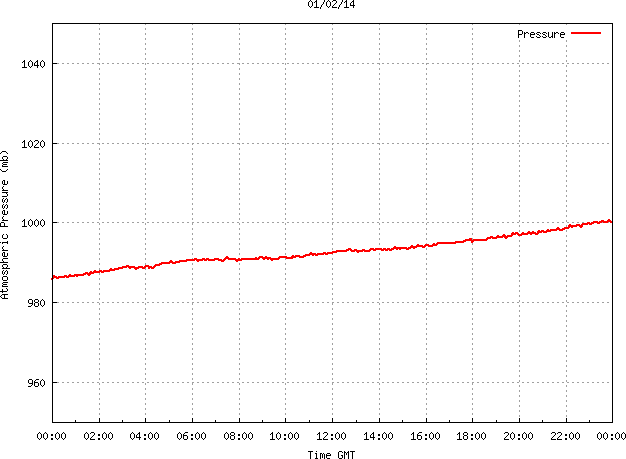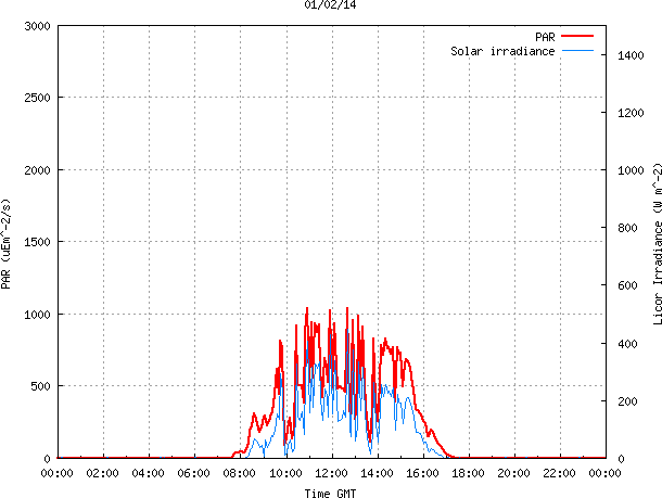 The PML meteorological station, situated on the south-west corner of the building roof, consists of a Hygroclip S3 temperature and humidity sensor housed in a radiation shield, a Mierij Meteo solid state wind sensor (MMW-005), a Chelsea instruments half-hemisphere PAR sensor, a Li-Cor pyranometer (LI-200SZ) and an Omni Instruments 6" tipping bucket raingauge (RG200). The data are logged every 5 minutes using a Pace Scientific XR5 data logger. The real-time rainfall data is likely in error - the correct values will be displayed after a time lag of approximately 24 hours. The meteorological station is sheltered from winds in the north-east and underestimates winds from this quarter. To use these data please contact Dr Tim Smyth.