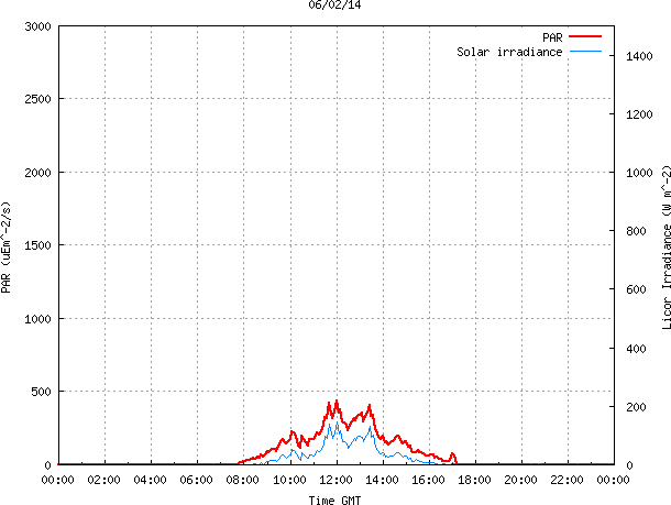 The PML meteorological station, situated on the south-west corner of the building roof, consists of a Hygroclip S3 temperature and humidity sensor housed in a radiation shield, a Mierij Meteo solid state wind sensor (MMW-005), a Chelsea instruments half-hemisphere PAR sensor, a Li-Cor pyranometer (LI-200SZ) and an Omni Instruments 6" tipping bucket raingauge (RG200). The data are logged every 5 minutes using a Pace Scientific XR5 data logger. The real-time rainfall data is likely in error - the correct values will be displayed after a time lag of approximately 24 hours. The meteorological station is sheltered from winds in the north-east and underestimates winds from this quarter. To use these data please contact Dr Tim Smyth.