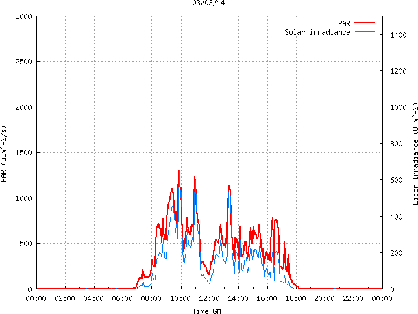The PML meteorological station, situated on the south-west corner of the building roof, consists of a Hygroclip S3 temperature and humidity sensor housed in a radiation shield, a Mierij Meteo solid state wind sensor (MMW-005), a Chelsea instruments half-hemisphere PAR sensor, a Li-Cor pyranometer (LI-200SZ) and an Omni Instruments 6" tipping bucket raingauge (RG200). The data are logged every 5 minutes using a Pace Scientific XR5 data logger. The real-time rainfall data is likely in error - the correct values will be displayed after a time lag of approximately 24 hours. The meteorological station is sheltered from winds in the north-east and underestimates winds from this quarter. To use these data please contact Dr Tim Smyth.