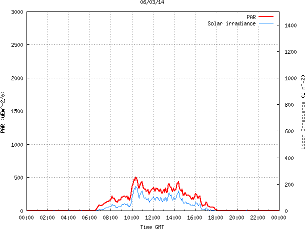 The PML meteorological station, situated on the south-west corner of the building roof, consists of a Hygroclip S3 temperature and humidity sensor housed in a radiation shield, a Mierij Meteo solid state wind sensor (MMW-005), a Chelsea instruments half-hemisphere PAR sensor, a Li-Cor pyranometer (LI-200SZ) and an Omni Instruments 6" tipping bucket raingauge (RG200). The data are logged every 5 minutes using a Pace Scientific XR5 data logger. The real-time rainfall data is likely in error - the correct values will be displayed after a time lag of approximately 24 hours. The meteorological station is sheltered from winds in the north-east and underestimates winds from this quarter. To use these data please contact Dr Tim Smyth.